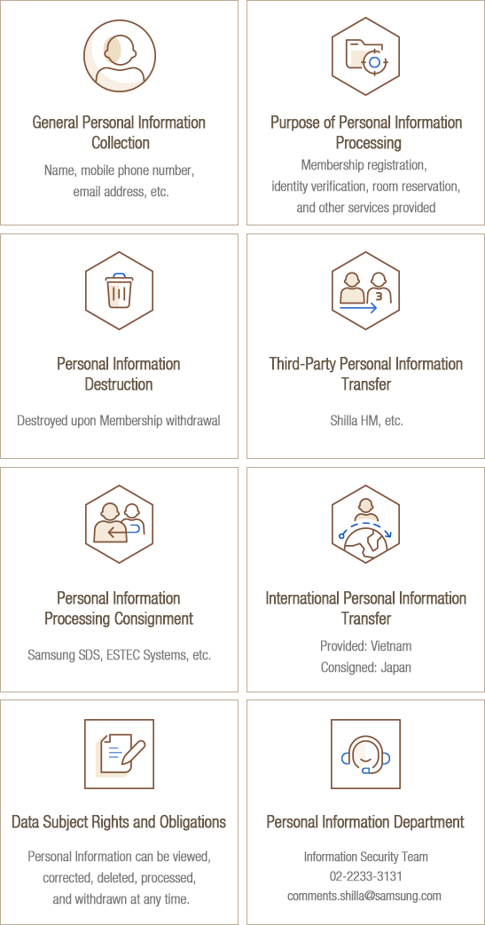 Secure network transmission between systems when making reservations, canceling, or changing reservations | Member Registration | Name (Korean, English), gender, date of birth, email address, contact number,and Shilla Rewards number | To provide Shilla Rewards services | Until membership withdrawal or withdrawal of consent |
